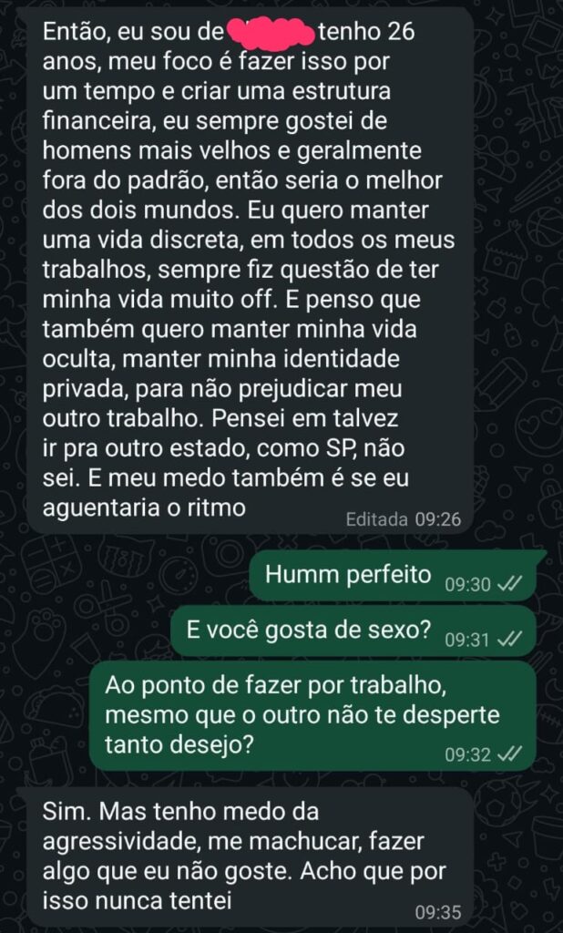 – Não falamos sobre isso pelo WhatsApp sem antes ver a garota pessoalmente, porque às vezes chegam aqui completamente diferente das fotos, muito Photoshop. Mas você, olha, vou até dizer, é mais bonita pessoalmente do que nas fotos que me enviou.