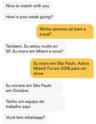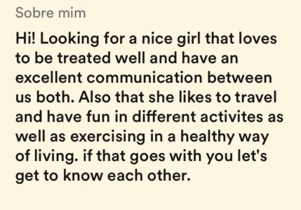 Nos conhecemos num aplicativo de relacionamento. Não, não foi no Tinder. Por sugestão de uma amiga e alguns seguidores, decidi experimentar o Bumble, que diziam ser mais elitizado, com pessoas mais bonitas e etc. Voilà, demos match! A descrição do seu perfil dizia o seguinte: