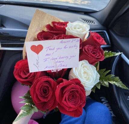 E tinha acertado. Após alguns minutos, o vejo ressurgindo na esquina, sorrindo, como se estivesse carregando um troféu, segurando algo nas mãos. Devido à distância, não consegui identificar de primeira o que era, mas quando se aproximou mais, pude ver. Se tratava de um lindo buquê de rosas vermelhas, com apenas duas rosas brancas, uma distante da outra, que, segundo ele, representava nós dois, comigo no Brasil e ele nos Estados Unidos. Achei muito fofinho o gesto, coloquei meu lado atriz em ação e demonstrei a maior empolgação com o mimo, mas lá no fundo não me impressionou tanto assim, pois, como falei, flores não é algo que me causa grande encantamento, apesar de serem mesmo muito lindas.
