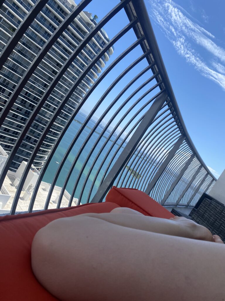 Ele me deixou na praia de South Beach, me mostrou um restaurante todo cor de rosa que eu poderia comer depois e rumou para o seu dentista. Aluguei uma espreguiçadeira e um guarda sol. Uma mulher ao meu lado, que também estava sozinha, puxou assunto, enquanto eu estava estirada tentando pegar um bronze.