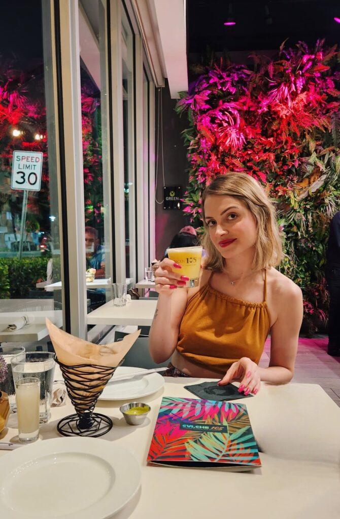 Saímos para jantar num restaurante maravilhoso, chamado CVI.CHE 105. Aquela noite estava muito gostosa, fosse pela comida, pela nossa interação um com o outro – parecíamos um casal em lua de mel – ou pelo clima tropical de Miami. Estava tudo perfeito, até tiramos algumas fotos de casal na mesa do restaurante.